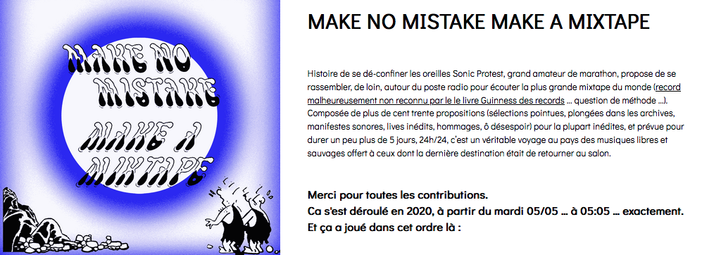 Since Tuesday 05/05 2020, it’s part of the 7 days non-stop program « MAKE NO MISTAKE MAKE A MIXTAPE » (Sonic Protest / covid time). As part of the program, it was played on the Wednesday 06/05 2020 between 23:30 and 02:05 of the next day, which is approximately the time it was originally played.