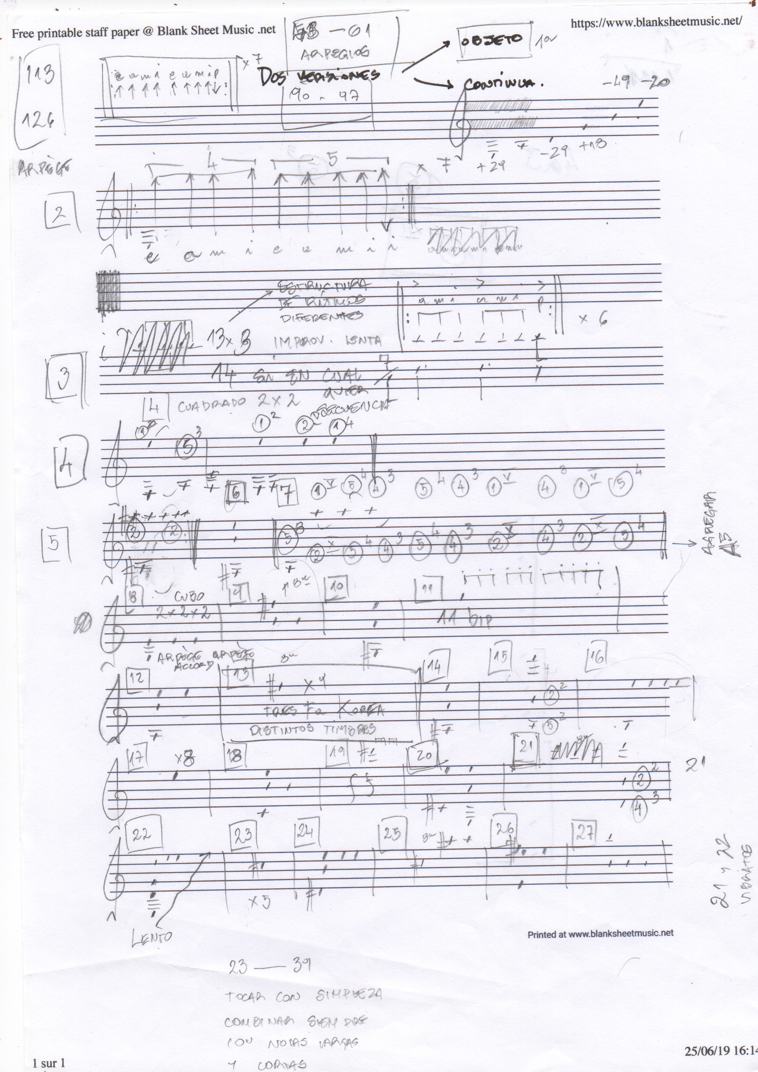 TABLE DE POUSSIÈRES 2018 - 2020 — Berivanel composition pour guitare de Jean-Luc Guionnet dédiée à Cristian Alvéar PROPOSITION PEU D'INTIMITÉ AVEC L'INSTRUMENT : LA BALANCE NE PENCHE PAS PROFITER DE LA SITUATION : MÉTHODE DE L'IDIOT L'exercice est bien-sûr impossible, et la posture introuvable — l'époché : on la cherche encore. Bien que dans le cas qui nous occupe, le point de départ soit réellement proche d'une vraie indifférence. Mais on n(e s)'oublie pas sur décision. Et l'ignorance amplifie parfois les standards et les clichés sans le savoir. Attention, donc. La musique à faire nous met, sans fin, en retard ou en avance sur l'hypothétique idiotie à atteindre — la nôtre. L'idiotie aime à se cacher. Donc, à jamais ni raccord, ni synchrone avec elle, c'est précisément dans l'effort d'y parvenir, et dans l'écart entre elle, cette idiotie potentielle, et le quotidien de la recherche, que peut arriver l'architecture d'une pièce, loin du savoir, donc, mais aussi, loin d'une table rase : et pas non plus entre les deux, c'est un triangle. Ainsi a commencé l'écriture de "table de poussières"... L'idiotie, c'est toujours voir la nuit derrière le soleil. Regarder l'instrument et, si l'on en a un : le toucher. Cela pour dire de ne pas se jeter sur les sons que l'instrument est supposé faire, et un résultat sonore à chercher, à viser. Une fois la guitare en main, ne pas se faire guitariste : ne pas prendre le masque du héro chevelu revu et vu par la force des choses, et s'enlever, bien au contraire, celui, bien plus tenace encore, du musicien (parce qu'avec le chelevu, au fond, c'est facile !). Passer par le détour de la vue, du toucher, avant même de produire quelque son que ce soit. En regardant les détails, en les scrutant, on essaye de sentir quelque chose de l'agencement des matières, mais surtout de comprendre quelque chose des divisions qui nous arrivent avec la guitare, quitte à le faire mentalement (une harpe ne se trouve pas facilement, j'avais une vieille guitare). Une iconographie peut servir, des plans, un schéma —en faire le dessin. Puis l'ergonomie : tenter d'en comprendre la logique digitale, les contraintes physiques, le temps que prend tel ou tel geste. Les actions impossibles. Les gestes simples. La place du corps. Toucher la forme, compter, comprendre et diviser à vue. À l'oreille, dessiner les positions, de mémoire deviser la forme, et retourner voir pour schématiser les gestes et vérifier les divisions. Où peuvent donc aller les mains, et à quelle vitesse ? Compter les cases dans le noir. |